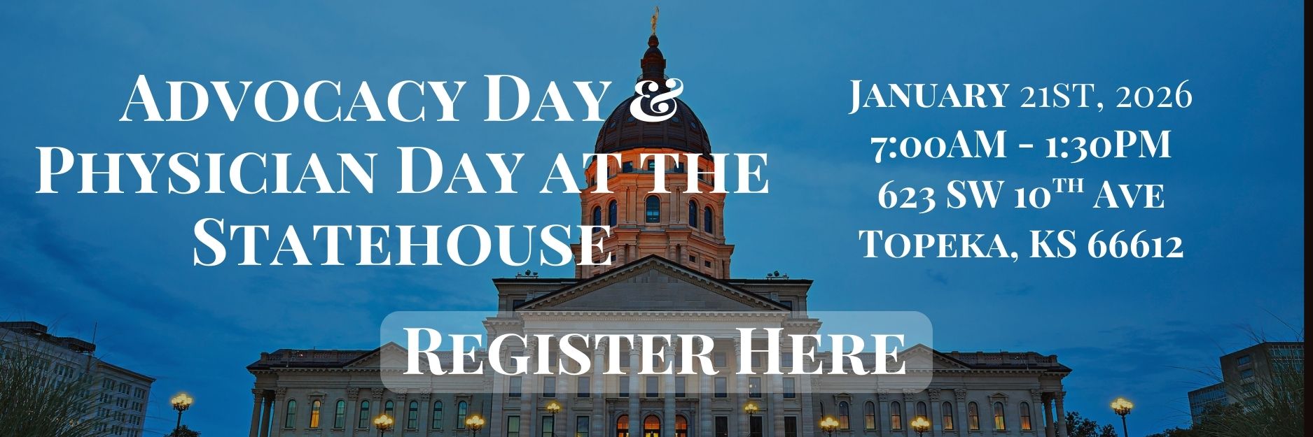 On behalf of the Kansas Medical Society, we would like to invite you to our upcoming annual Advocacy Day on January 21st, 2026. You will join physicians from across the state, of all specialties to learn about issues impacting the house of medicine. This opportunity is a great chance to connect with your legislative leaders and guide decision-making to generate support for policies on critical issues.